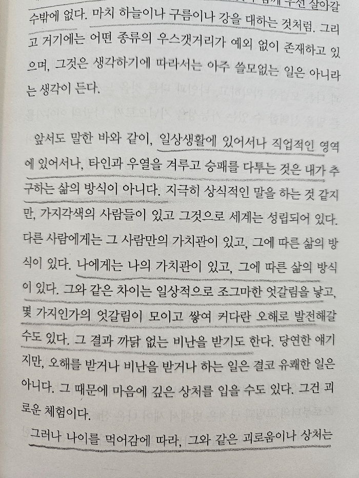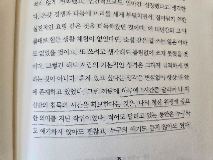 하루키 특유의 '공백'에 대한 철학이 느껴진다. 단순히 달리기가 아니라, 의도적으로 비워낸 시간과 공간 안에서 진짜 나를 만나는 일, 허우적거리는 복잡한 삶 속에서 정말 중요한 포인트이다.