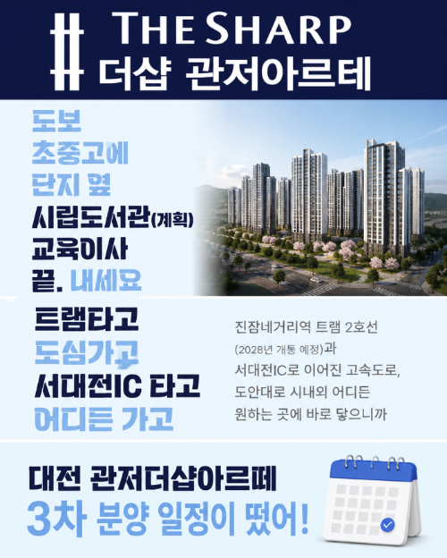 대전 서구 관저동, 이미 대전에서는 "살기 좋은 동네"로 꾸준히 언급되는 지역인데요. 이번에 '더샵관저 아르떼 3차 분양 일정'이 공개되었습니다. 관저라는 지역이 다시 한번 주목받고 있습니다. 사실 단순한 분양이 아니라, 지금 타이밍이 왜 중요한지를 이해해야 합니다.