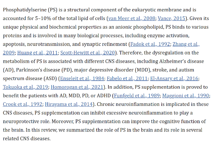 서구권에서는 이미 오래전부터 뇌건강과 PS의 관계에 대한 방대한 연구들이 진행되어왔다. 많은 연구 결과들에서 포스파티딜세린(PS)이 알츠하이머병, 파킨슨병, 주요 우울장애, 뇌졸중, 자폐 스펙트럼 등을 포함한 다양한 중추신경계 질환과 관련이 있으며, ADHD환자에게도 도움이 된다고 보고했다.